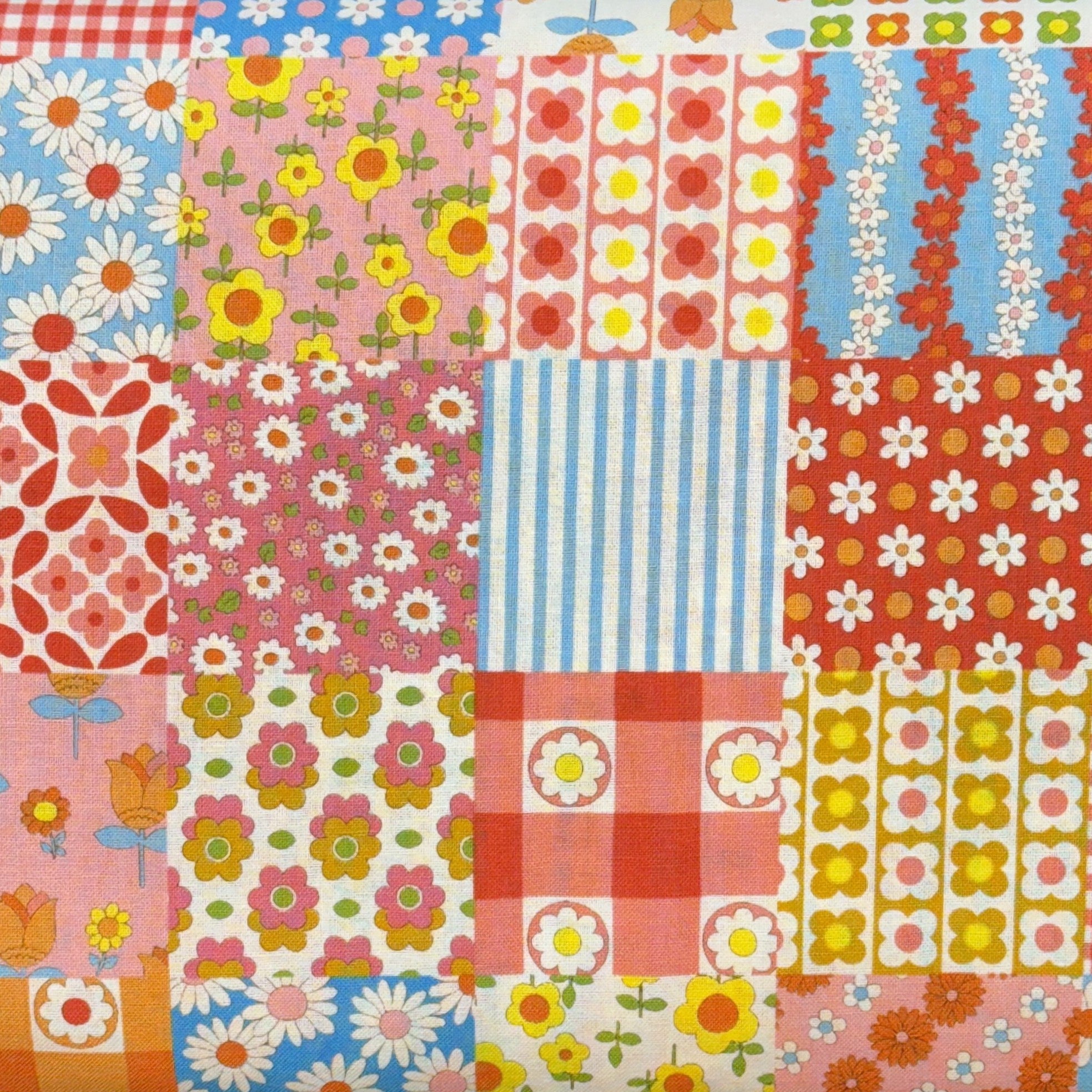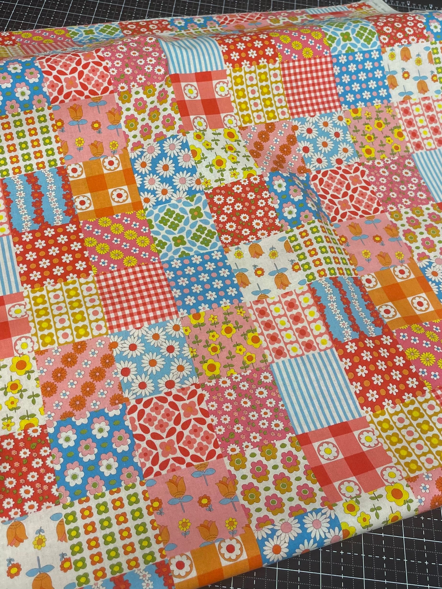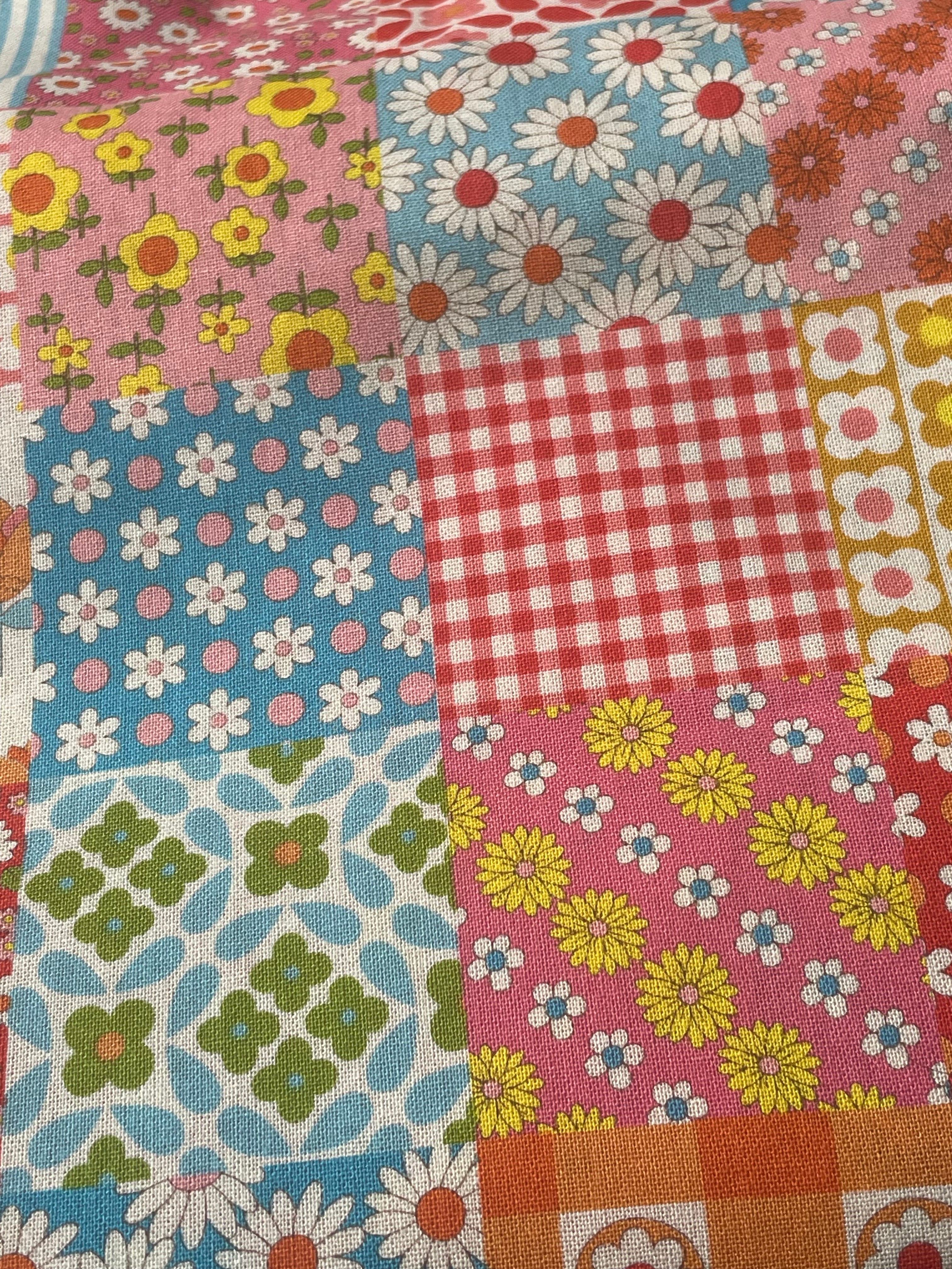 Flower Days Patchwork in Red by Koko Seki is everything that makes you think of the 70s, daisies, gingham, patchwork and all a punchy red, pink, orange with pops of sky blue colour scheme. Very Carol King! The 100% cotton fabric has an almost lightweight linen feel at 135gsm and would be groovy in any project especially if you'd like a shortcut cheater style print.