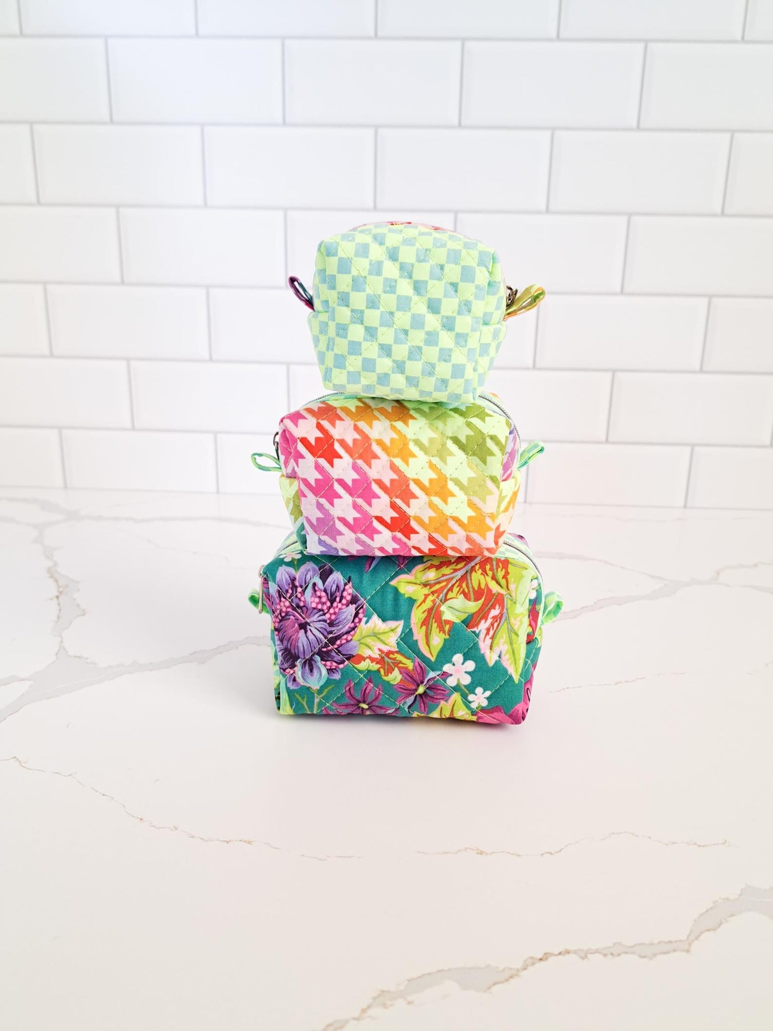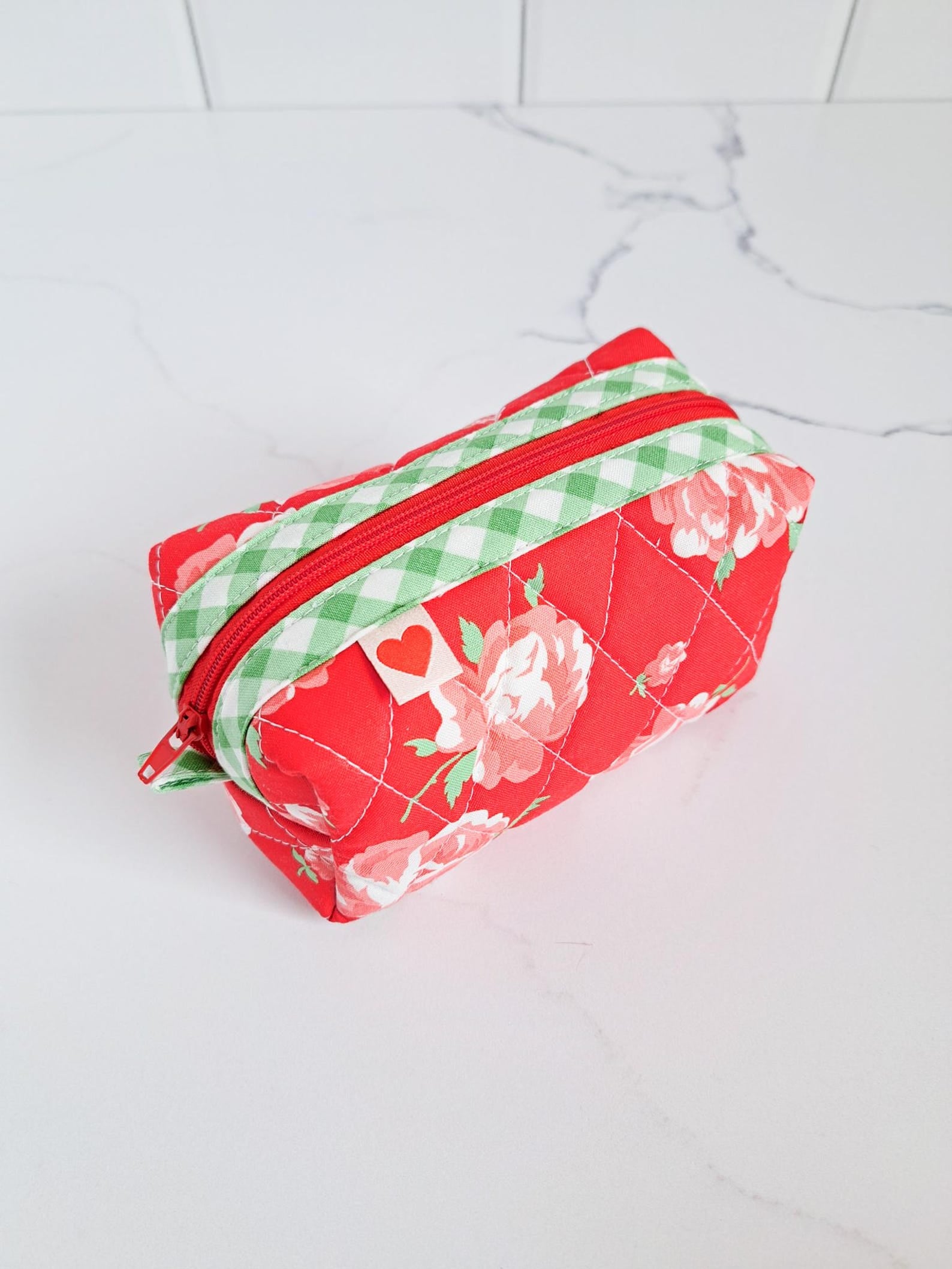 The Foxboro Pouch Pattern is a quilted zipper pouch digital download PDF pattern that includes three size options. These tiny boxy pouches are perfect for storing your tiniest belongings: binding clips, safety pins, spools of thread, small sewing notions, earbuds, a deck of cards, band-aids, makeup, jewelry, etc.