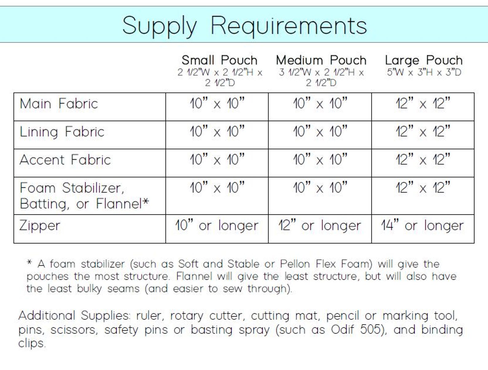 Quilted Pouch Pattern in three sizes, see last picture for requirements including Soft and Stable and Zippers.