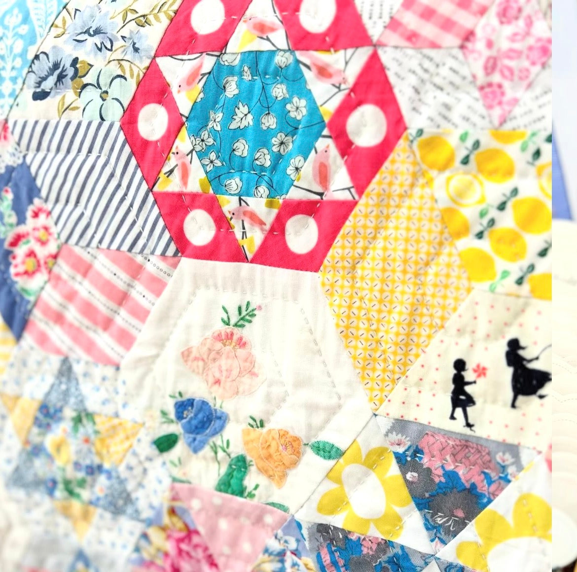 The Sweet Sunday Quilt is inspired by the many beautiful vintage fabrics I’ve collected. This quilt has been made with a selection of soft pink, blue, and yellow fabrics found in-store, as well as vintage cross stitch napkins, tablecloths, and embroidery pieces.
