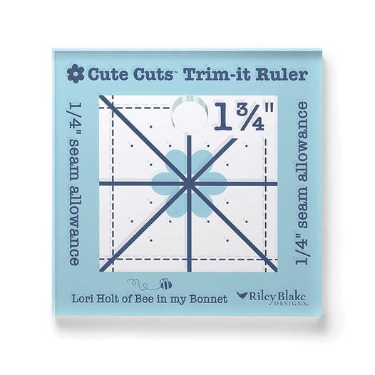 The Trim-it™ Rulers by Lori Holt of Bee in my Bonnet are non-slip and easy to use for trimming up your blocks after piecing, applique or embroidery. Use the diagonal lines to easily center your block when trimming and use the colored outside 1/4in seam allowance marks to help you see what will show of your block after sewing it into your quilt. The ruler has aqua and denim markings printed in 1in grids marked in 1/8in and 1/4in increments.